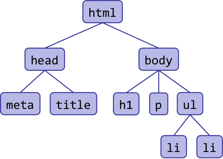 La structure des documents HTML est arborescente : les balises correspondent aux noeuds de l'arbre et les relations de contenance entre éléments (balises) correspondent aux arcs entre les nœuds . Un élément racine contient tous les autres éléments. La figure ci-dessous montre la structure arborescente du fichier HTML utilisé en exemple.